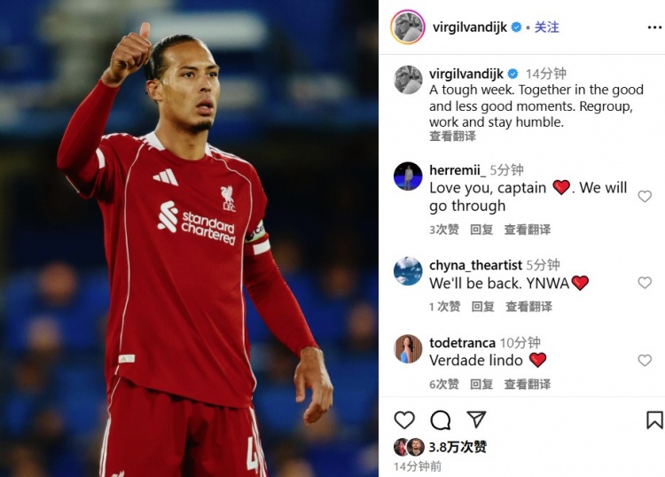 范迪克写道:这是艰难的一周。无论顺境逆境,我们都团结在一起。重整旗鼓,努力工作,保持谦逊。