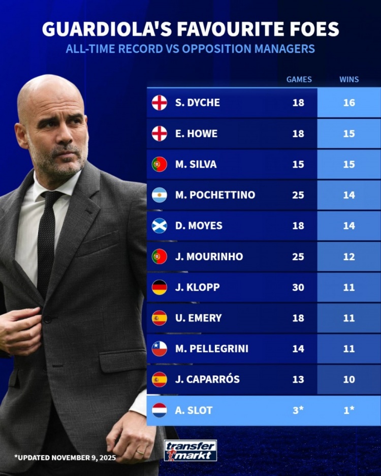 11月10日讯 曼城在本轮英超焦点战3-0完胜利物浦,瓜帅也取得了执教生涯对阵斯洛特的首胜。《转会市场》也列出了瓜帅执教生涯对阵教练的胜场最多榜。