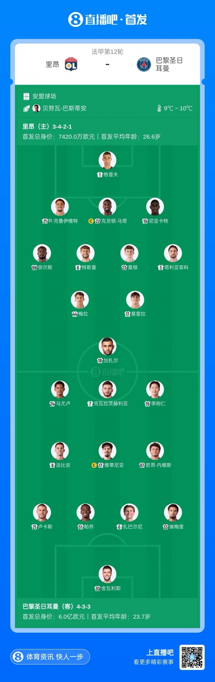 11月10日讯 法甲第12轮,巴黎圣日耳曼客战里昂,赛前双方首发公布。