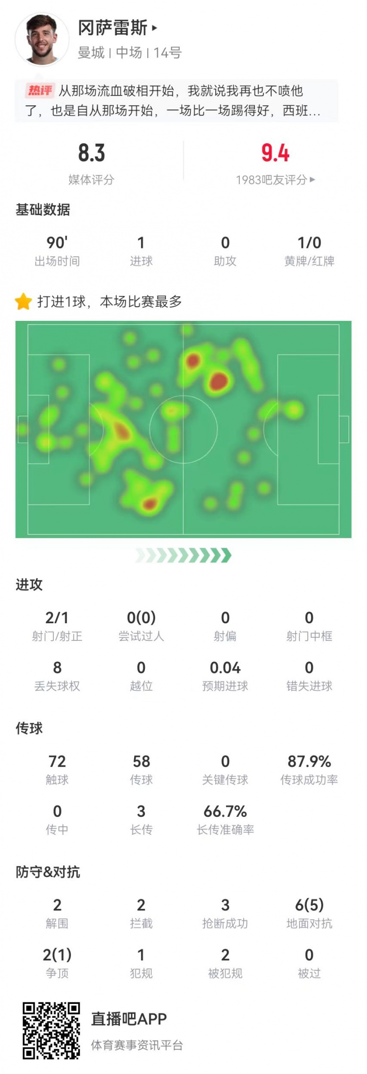 11月10日讯 曼城在本轮英超焦点战3-0完胜利物浦,尼科-冈萨雷斯本场数据如下: